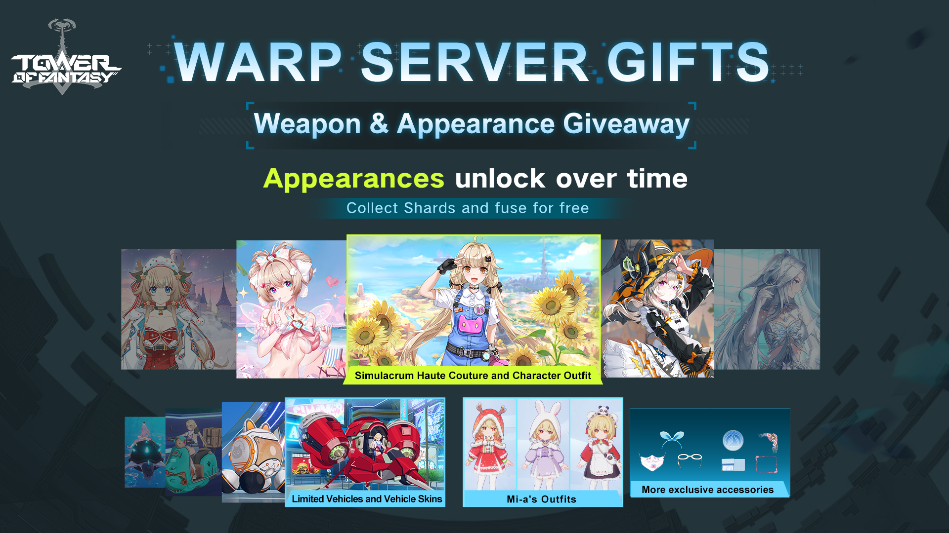 - Appearances Unlock Over Time in Warp Server: Collect shards to fuse Simulacrum Haute Couture, Outfits, and Vehicle Skins for free.