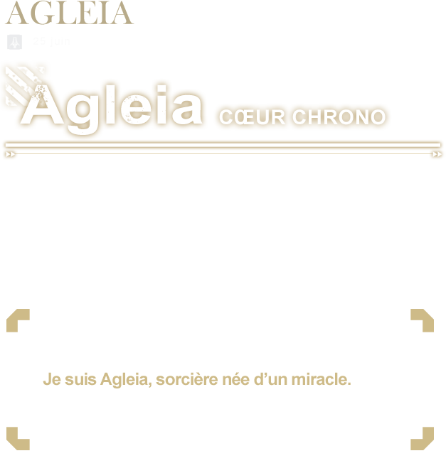 Avant le Cataclysme, Agleia s’est enfuie de chez elle après un désaccord avec son père. Elle a participé à l’opération de Mercredi pour voler les documents classifiés d’Aurora. Après l’incident, elle a été envoyée à Kailo, ce qui lui a permis d’échapper au Cataclysme lui-même. Mais ce faisant, elle a perdu presque tous ceux qui lui étaient chers.