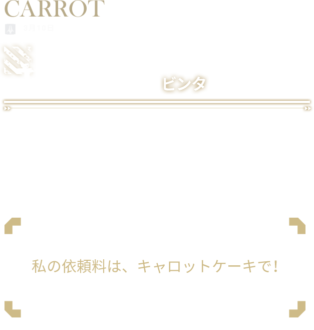 キルオから来た宇宙の旅人。アッシャー号は未知の襲撃を受け、その乗員の一人であるキャロットは脱出ポッドを使って艦を離れ、偶然にもアーシャのベンジスへと墜落した。彼女を拾ったのはヒルダだった。