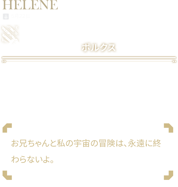ヘレンネは幼い頃から両親と兄に守られて育ったため、人見知りが激しく、兄がいないと他人と話すことすらできなかった。ポルクスが消えてからというもの、ヘレンネは兄から贈られたクマのぬいぐるみを心の拠り所とし、それを兄と見立てて話しかけるようになった……