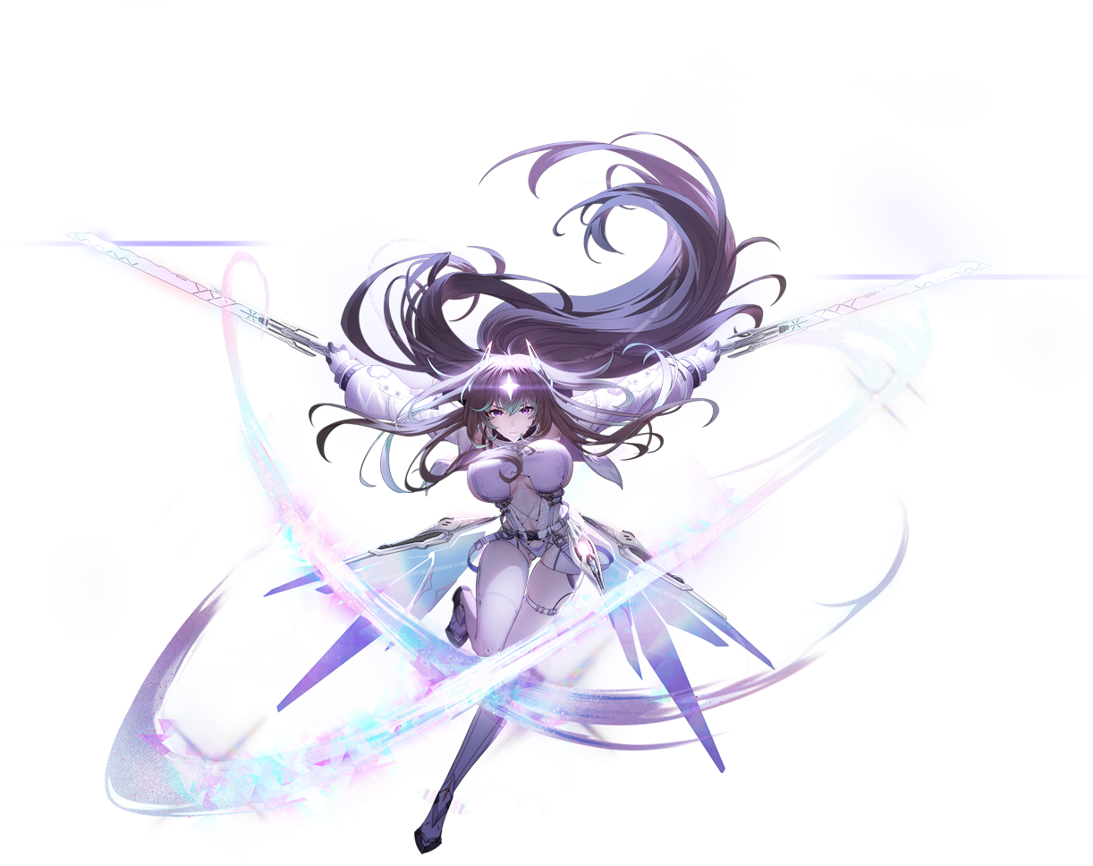 A girl from another dimension, with beautiful short blue hair and dressed in a white combat suit. She piloted her EVA to travel through time and space and arrive at Vera.