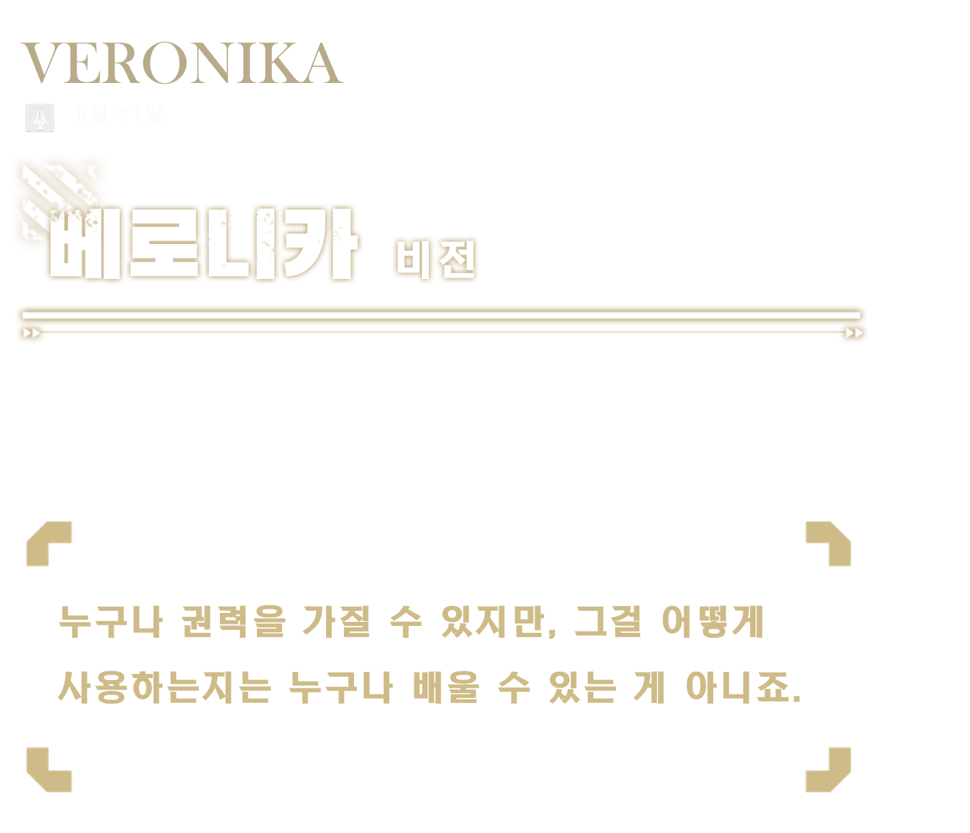 베로니카 장군은 우리를 이끌어 빛나는 새로운 시대를 개척할 것입니다. 호프 함대의 대원들은 이렇게 말합니다. 그녀는 정직합니다. 개인적인 선호로 어떤 부하도 편애하지 않으며, 오직 확실한 결과로만 상벌을 논합니다.