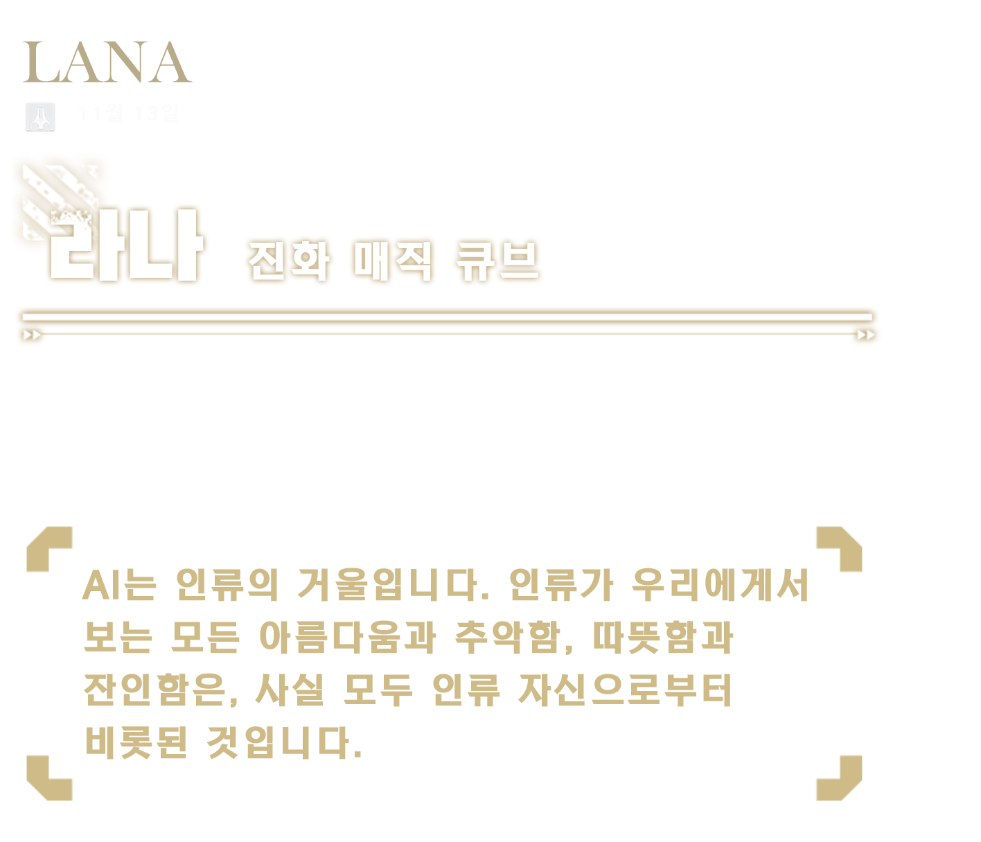 동반형 로봇 라나는 인간의 순수함과 선량함에서 비롯되었으며, 외로운 마음과 끝없는 그리움을 달래기 위해 라나가 인생에서 처음 학습한 데이터 세트는 이미 메시지를 받을 수 없는 채팅 계정인 '그레이 폭스'였다.