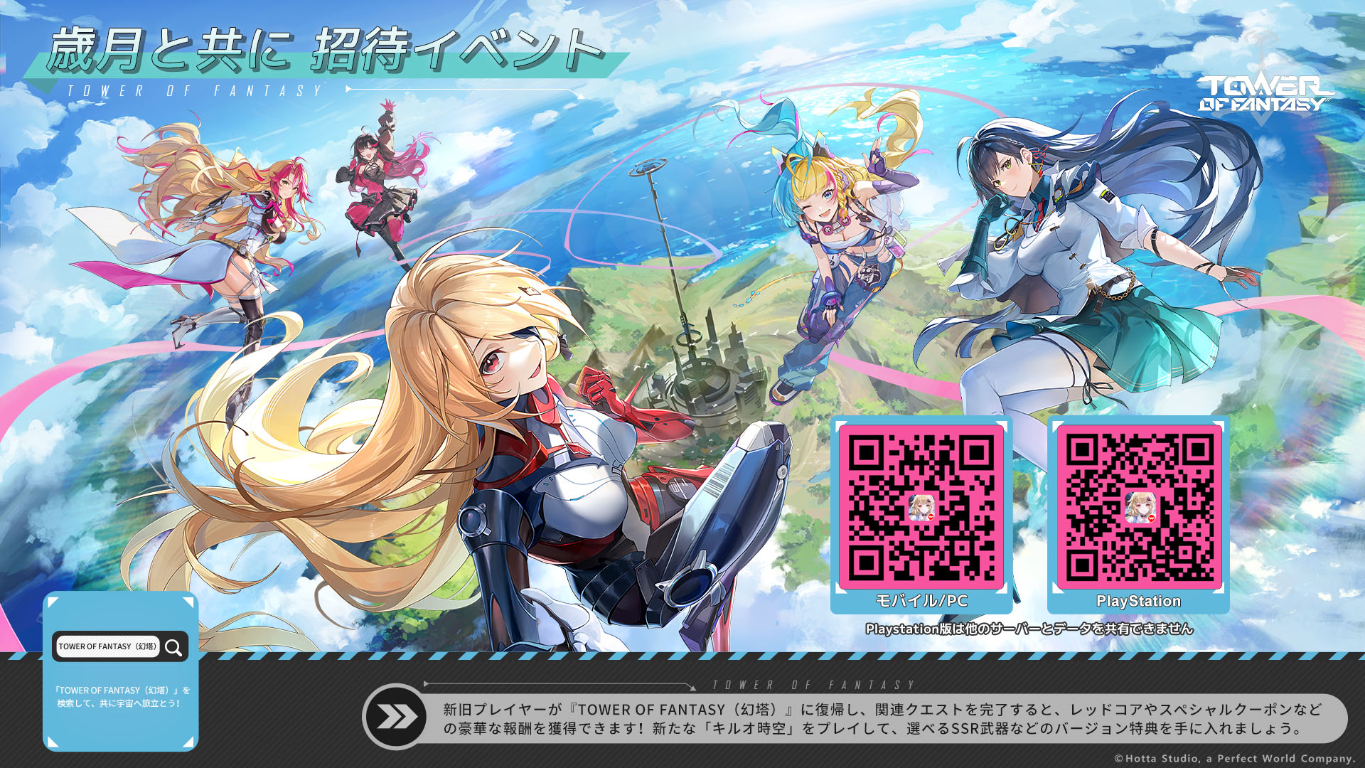 7、シェアポスターには、現在ユーザーのキャラクターが所属するサーバーにQRコードが自動生成されます。招待されたプレイヤーがQRコードをスキャンすると、招待者の所属サーバーのダウンロードページへ案内されます。パーティー招待はサーバーの制限を受けません。すでに他のサーバーでキャラクターをお持ちの場合、ゲーム内のイベントページで招待コードを入力すると参加できます。(例:FateサーバーのプレイヤーAが招待を送り、EdenサーバーのプレイヤーBが招待を受けてパーティーに参加した場合、両プレイヤーともクエストを達成すると該当の報酬を獲得できます。) ※本イベントにおいて、PS版とモバイル/PC版は共通しておりません、予めご注意ください。
