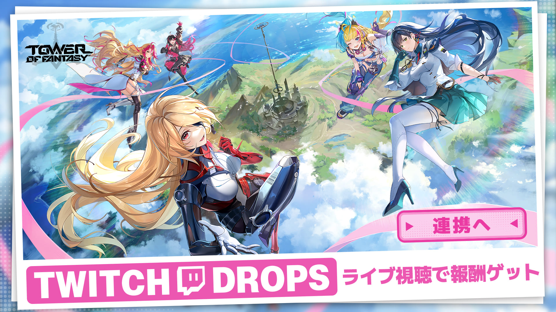 Twitch Dropsは、Twitchのライブ配信を視聴するだけでゲーム内報酬を獲得できるイベントです。『Tower of Fantasy(幻塔)』ゲームアカウントとTwitchアカウントを連携するだけで参加できます。