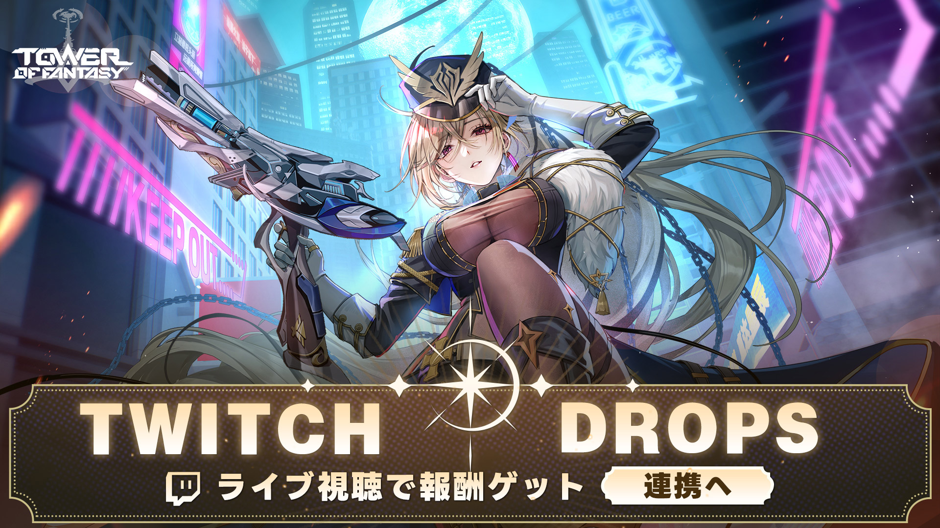 Twitch Dropsは、Twitchのライブ配信を視聴するだけでゲーム内報酬を獲得できるイベントです。『Tower of Fantasy(幻塔)』ゲームアカウントとTwitchアカウントを連携するだけで参加できます。